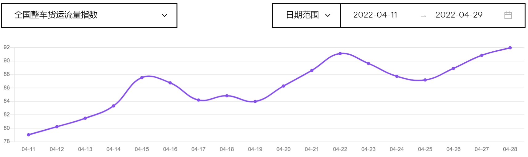 G7大数据显示,4月11日起,全国整车货车流量开始逐渐上升,流量指数从79%上升到了90%,但仍处于波动状态。最近几天流量指数小幅上升,4月28日为92%。