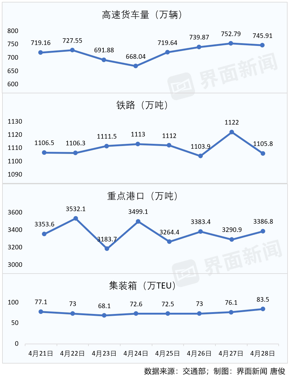 根据交通部公布的数据,过去8天来,全国货运量同样呈现波动中缓慢上涨的趋势。其中,高速公路货车通行量在4月21日为719万辆,4月24日一度降至668万辆,之后又开始上涨,4月27日上涨到752.8万辆,4月28日又有所下降。