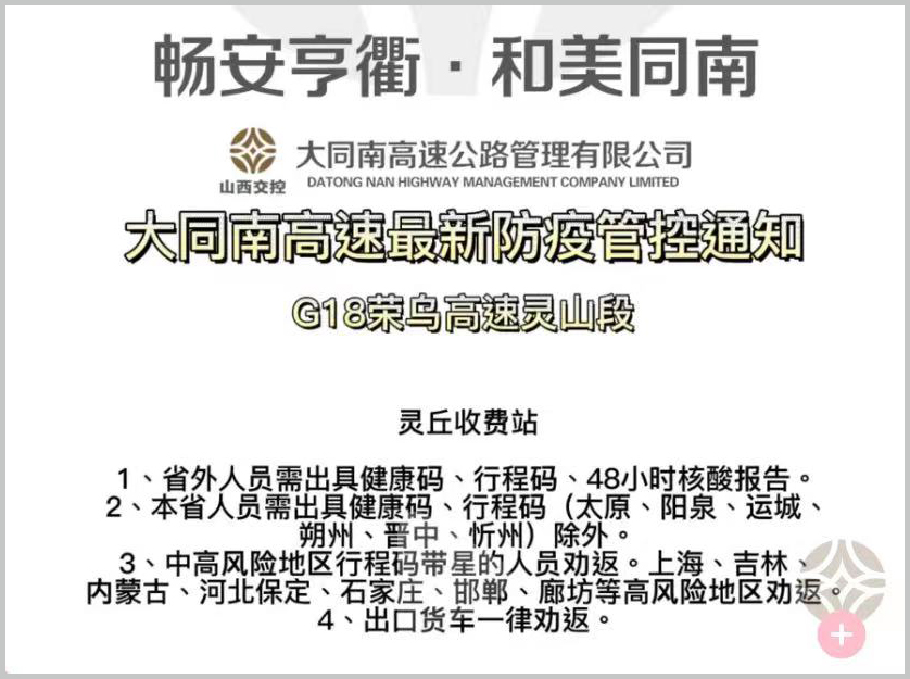 例如,大同南高速公路管理有限公司4月28日发布通知,在G18荣乌高速灵丘收费站出口,小车可以通行,但货车一律劝返,中高风险地区行程码带星人员也劝返。大同南高速公司管辖汤头收费站、平型关收费站、浑源西收费站、浑源东收费站、浑源北收费站、应县收费站等高速口,同样对货车进行劝返。