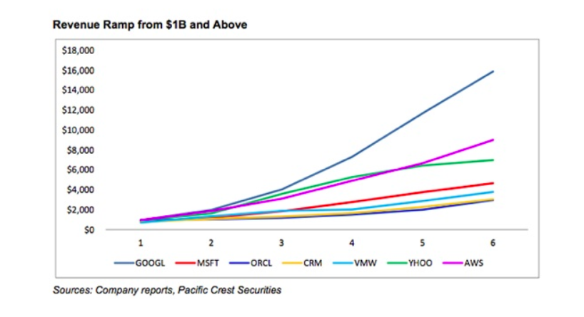 市场分析公司Pacific Crest Securities曾在2014年统计过,如果把亚马逊云服务(AWS)当做是一家独立的科技公司,那么它会是在收入达到10亿美元后增速历史第二快的企业级IT公司,仅次于Google。