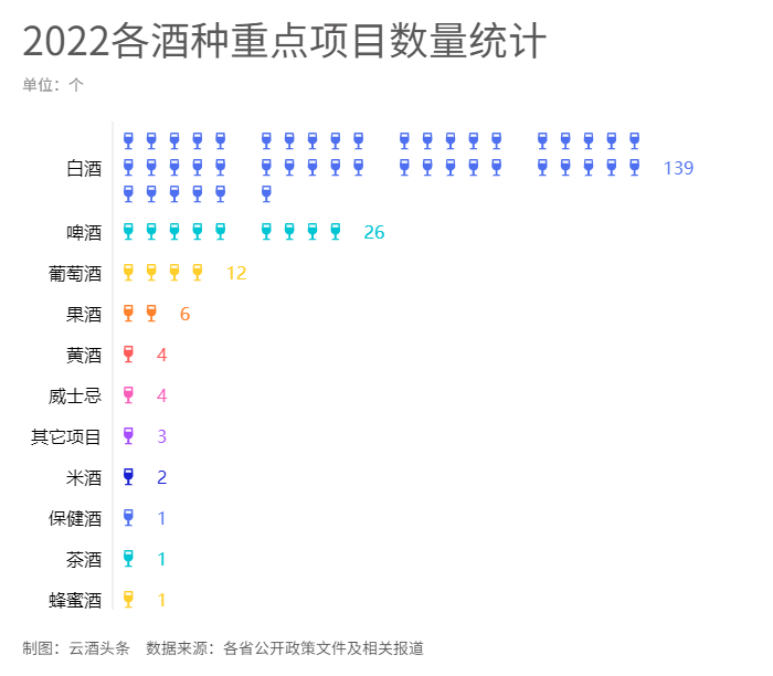 截至目前,我国各省市区发布的涉酒重点项目中,涉及白酒、啤酒、黄酒、葡萄酒、威士忌、果酒、米酒、茶酒、保健酒、蜂蜜酒及其他11个方向。