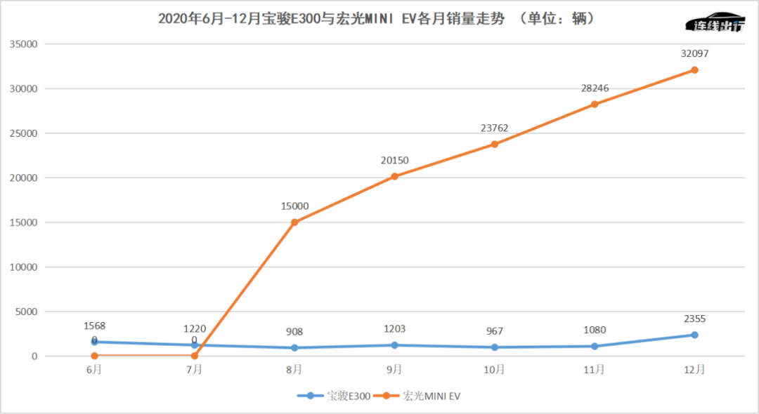 而在2020年全年,宏光MINI EV从8月上市至年底五个月的销量就达到了32097辆,反观宝骏E300自当年6月上市截至年底7个月的销量仅达到了9301辆,前者销量几乎是后者的三倍之多。