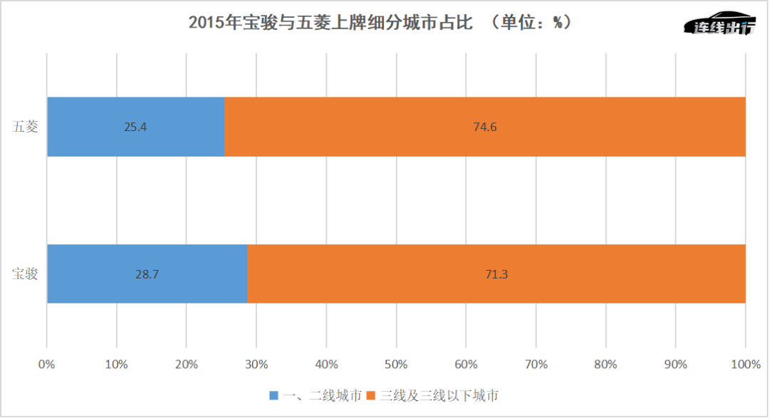 据易车统计数据显示,宝骏品牌成立的第五年,也就是2015年,宝骏和五菱品牌车主上牌细分市场占比来看,五菱有25.4%的车主来自一二线城市,剩下74.6%的车主来自三线及三线以下城市。