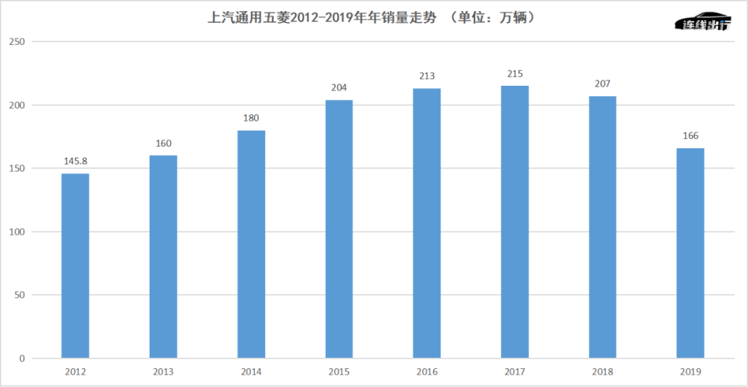上汽通用五菱2012-2019年年销量走势,数据来源于公开数据,连线出行制图
