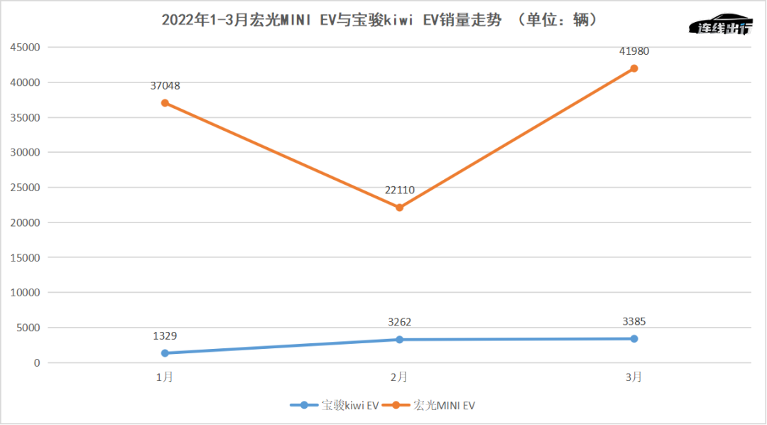 2022年1-3月宏光MINI EV与宝骏kiwi EV销量走势,数据来源于乘联会,连线出行制图