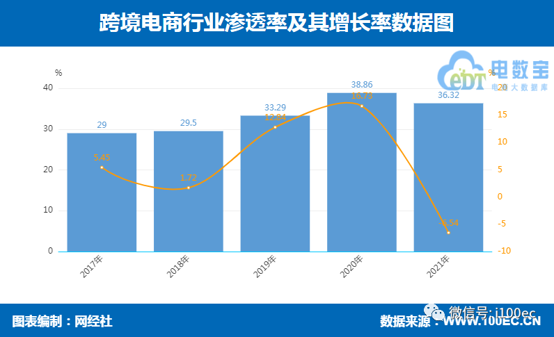 报告显示,2021年中国跨境电商交易额占我国货物贸易进出口总值39.1万亿元的36.32%。2017-2020年跨境电商行业渗透率分别为29%、29.5%、33.29%、38.86%、36.32%。2021年受诸多跨境电商企业经营受损,以及中国货物贸易进出口增长21.4%的背景下,跨境电商行业渗透率占比依然超过35%。未来随着行业规模不断增长,渗透率也将不断提升。