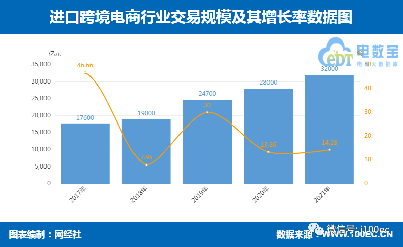 2021年中国进口跨境电商市场规模3.2万亿元,较2020年的2.8万亿元同比增长14.28%。