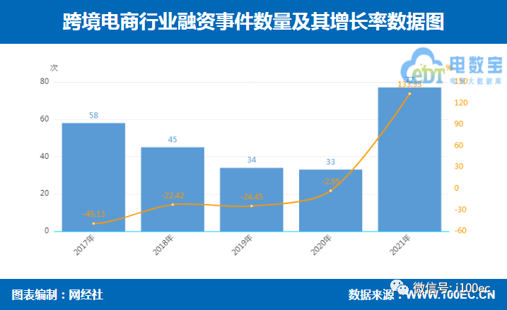 2021年中国跨境电商共发生77起融资,同比增长133.33%。