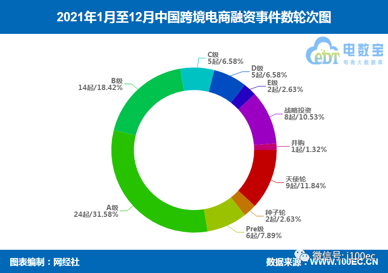 在融资轮次上,2021年中国跨境电商共发生77起融资。其中,天使轮9起、Pre轮6起、A轮24起、B轮14起、C轮5起、D轮5起、E轮2起、战略投资8起、并购1起、种子轮2起。