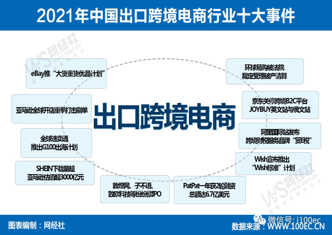 2021年中国出口跨境电商行业十大事件包括:eBay推大货重货优品计划、亚马逊全球开店重拳打击刷单、全球速卖通推出G100出海计划、SHEIN下载量超亚马逊估值超3000亿元、敦煌网、子不语、致欧科技等纷纷欲IPO、PatPat一年获2轮融资总额达6.7亿美元等。