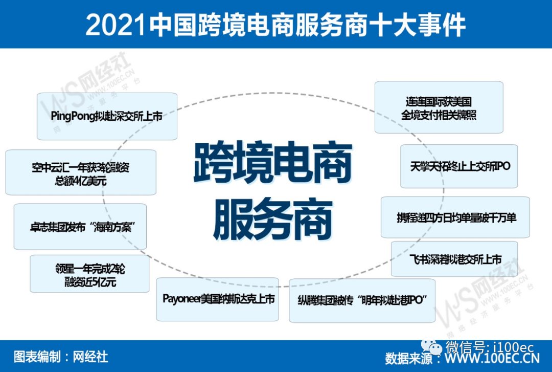 2021中国跨境电商服务商十大事件包括:PingPong拟赴深交所上市、空中云汇一年获3轮融资总额4亿美元、递四方日均单量破千万单、领星一年完成2轮融资近5亿元、Payoneer美国纳斯达克上市、纵腾集团被传“明年拟赴港IPO”、飞书深诺拟港交所上市、连连国际获美国全境支付相关牌照等。