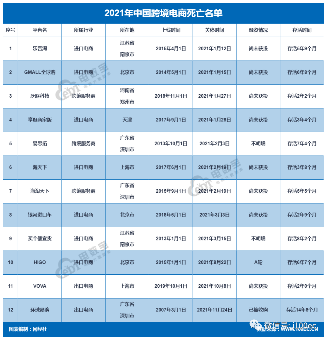 据网经社“电数宝”电商大数据库显示,2021年跨境电商“死亡”数12家,分别为:VOVA、HIGO、买个便宜货、银河进口车、海淘天下、海天下、易思拓、享逛商家版、泛联科技、GMALL全球购、乐吾淘等。(注:本数据库定义的“死亡”包括公司破产、倒闭、重大重组、创始人跑路、平台关停或停更等)