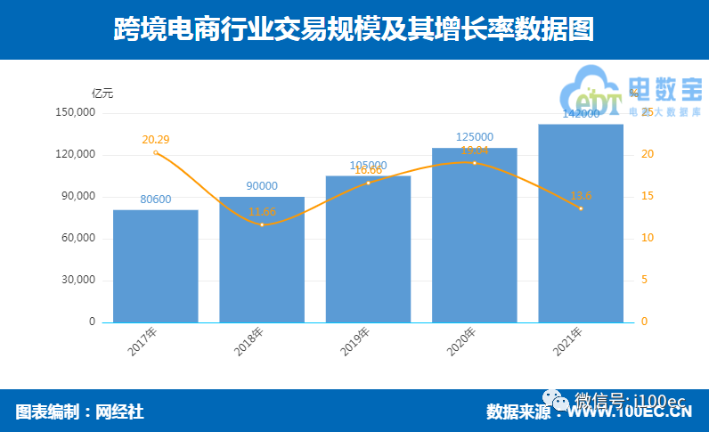 在此背景下,4月27日,电子商务研究中心发布《2021年度中国跨境电商市场数据报告》(报告下载:http://www.100ec.cn/zt/2021kjdsscsjbg/)。该报告根据网经社“电数宝”(DATA.100EC.CN)电商大数据库编写而成。2021年中国跨境电商市场规模14.2万亿元,较2020年的12.5万亿元同比增长13.6%。