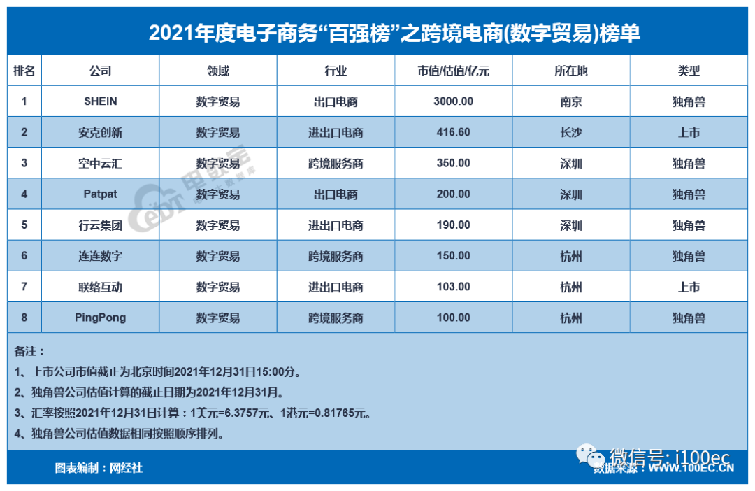 据网经社电子商务研究中心发布的《2021年度中国电子商务“百强榜”》显示,100家上榜公司总值(市值+估值)达8.12万亿元。其中,8家跨境电商(数字贸易)公司上榜“百强榜”,总值4509.6亿元。
