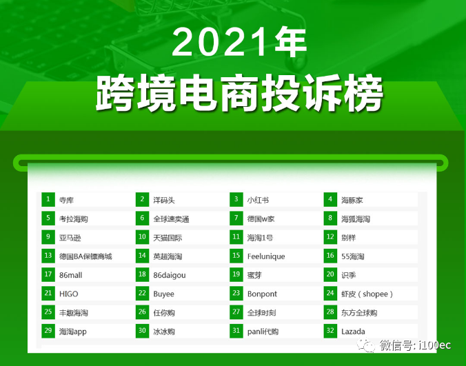 在用户投诉方面,国内电商专业消费调解平台“电诉宝”2021年受理的跨境电商领域用户有效投诉显示,共32家平台上榜。入选投诉榜前10的依次为:寺库、洋码头、小红书、海豚家、考拉海购、全球速卖通、德国W家、海狐海淘、亚马逊、天猫国际;