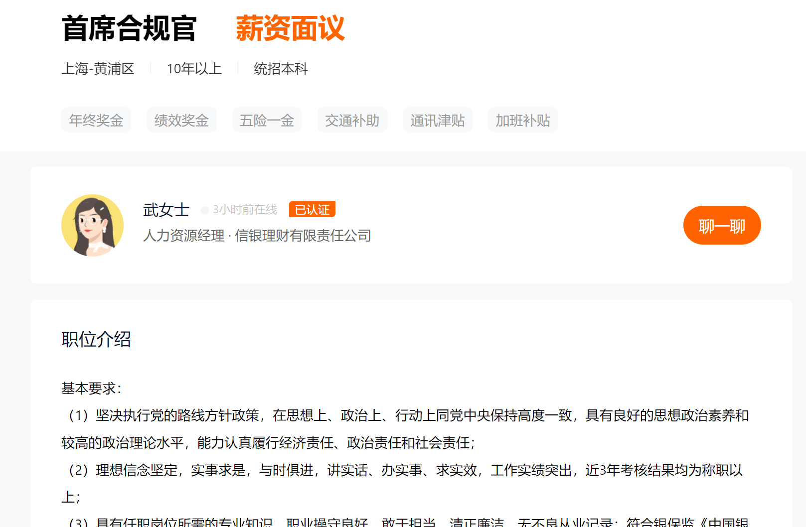 事实上,已有理财公司公开对外招聘首席合规官。界面新闻记者在第三方招聘网站看到,信银理财在该网站发布了首席合规官的招聘信息,主要职责包括“协助公司总裁及分管领导构建公司合规管理体系,贯彻执行有关法律法规及公司重大决策及规章制度的落实;督促指导公司人员积极主动识别、规避经营管理中的风险,依法合规开展业务经营活动。”等,要求具有15年以上相关工作经验。
