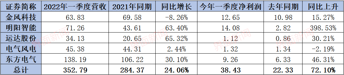 截至目前,金风科技(002202.SZ)、明阳智能(601615.SH)、运达股份(300772.SZ)、电气风电(688660.SH)、东方电气(600875.SH)五家风电整机商已发布一季度财报。