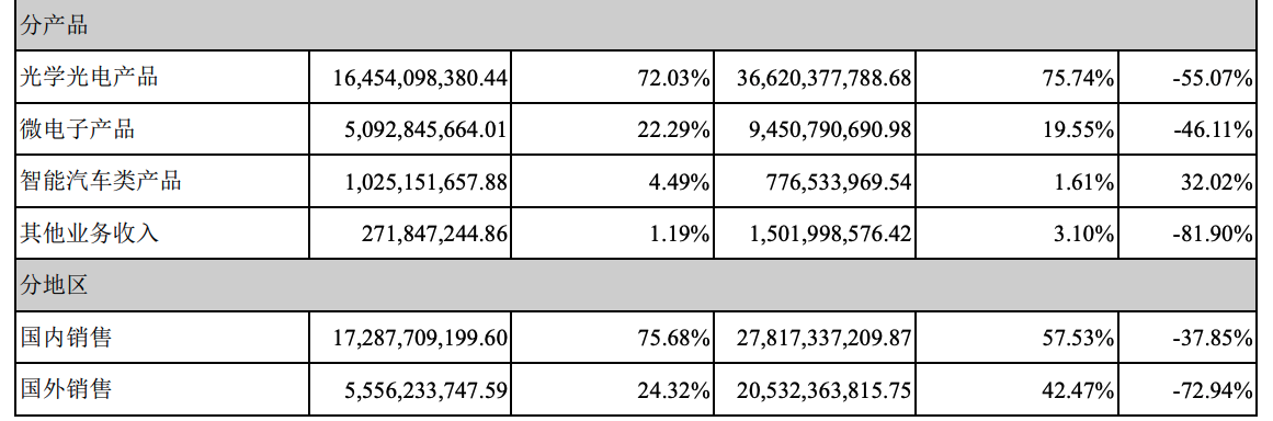 分产品看,公司当期光学光电产品收入占营收大头,占比达72.03%,实现收入164.54亿元,同比下滑55.07%;微电子产品收入50.93亿元,同比下滑46.11%;智能汽车类产品是当期唯一实现增长的业务,收入增长了32.02%至10.25亿元,占总收入的4.49%。但值得注意的是,智能汽车类产品毛利率很低,仅为1.48%,同比上期减少了15.69个百分点。