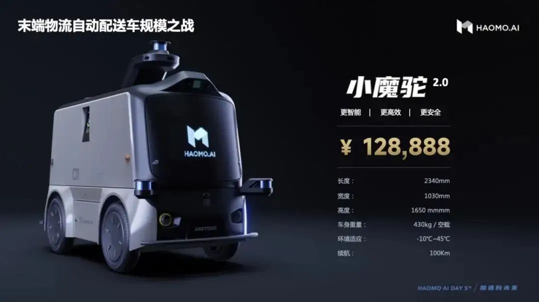 4月19日,由原长城汽车智能驾驶开发部独立而成的自动驾驶公司毫末智行发布了一款末端物流自动配送车——毫末小魔驼2.0,售价12.88万元,将此类产品价格首次拉到十万元级。