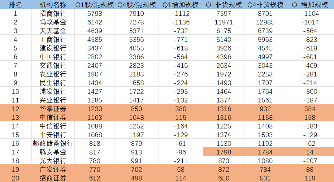 蚂蚁基金今年一季度股票+混合基金保有规模减少了1136亿元,非货规模减少了1014亿元。