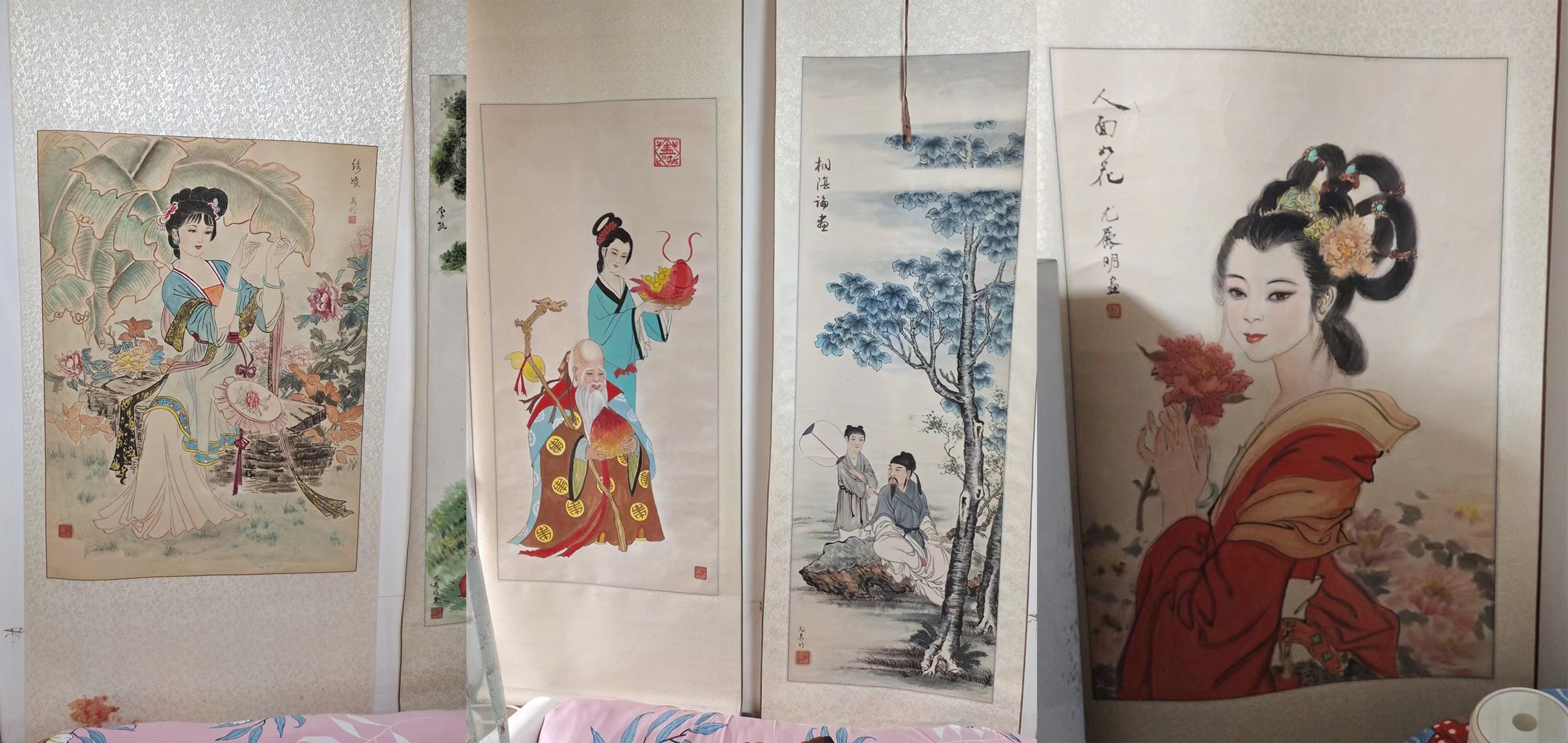 午休过后,通常是尤阿婆的电视时间。4月30日下午5点多,正在看绘画节目的尤阿婆在电话中说起了自己曾经的爱好:“我喜欢画画,退休以后从73岁开始学画,现在手抖了就不能画了。”寿星公、仕女、绣娘……尤阿婆家中的墙壁上挂满了她的工笔画作品。