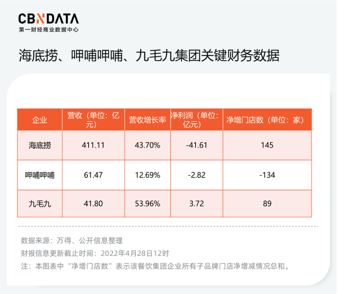整体来看,三大集团的营收普涨,但海底捞却在营收增长43.7%的情况下,净亏损超40亿元。相对来说,呷哺呷哺净亏损数额相对较小,但值得注意的是,这是呷哺呷哺2014年上市以来首次录得全年亏损。而另外一家九毛九关键数据相对好看一些,净利润和营收都保持了正增长。