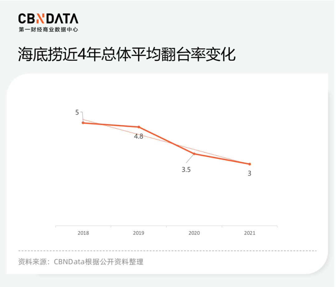 但对于海底捞来说,这次翻台率的下降就没有可以弥补的余地了。平均每天3次的翻台率,是近5年来的最低水平。