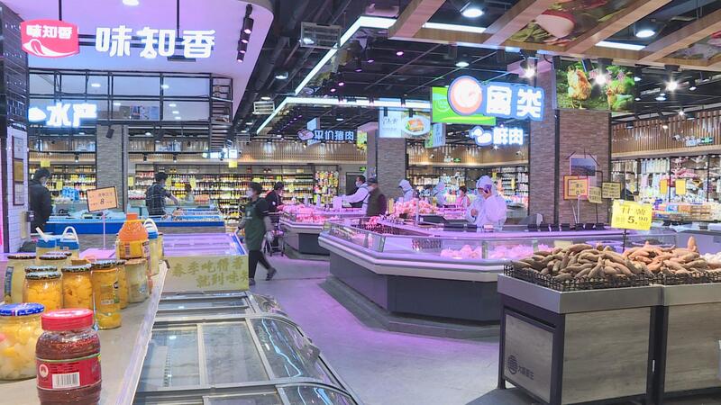 记者看到,超市的货架上,商品琳琅满目,蔬菜瓜果、米面粮油、肉类速食等陈列整齐。在昨天收到新的管控要求之后,超市连夜准备,增强人手、备足货品,目前上架了约1万多个品种。目前店内复工人员25人,进行货物分拣和配送。