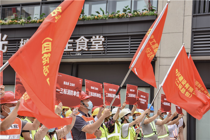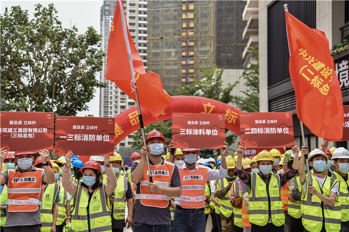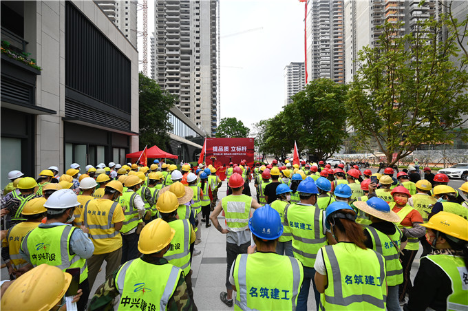 另外,现场还有四家总承包单位负责人出席了本次誓师动员大会,他们分别对其负责的版块进行了进度通报,并宣誓确保按工期按质交付。檀境项目一标段的总承包单位-天祥建设集团股份有限公司-项目负责人徐峰峰,在现场表示:天祥建设在政府建设主管部门的协调支持下,项目按计划有序建设中。目前项目仍处于主体结构施工阶段,后续将全力以赴,精心组织施工生产,确保按期竣工交付。