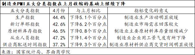 从规模来看,4月份大中小型制造业企业PMI均处于收缩区间。大型企业自2020年3月以来,首次跌破荣枯线,4月份录得48.1%,较3月份下降了3.2个百分点;中型企业连续第二个月处于收缩区间,4月份录得47.5%;小型企业已经连续12个月处于荣枯线下,4月份进一步降至45.6%。