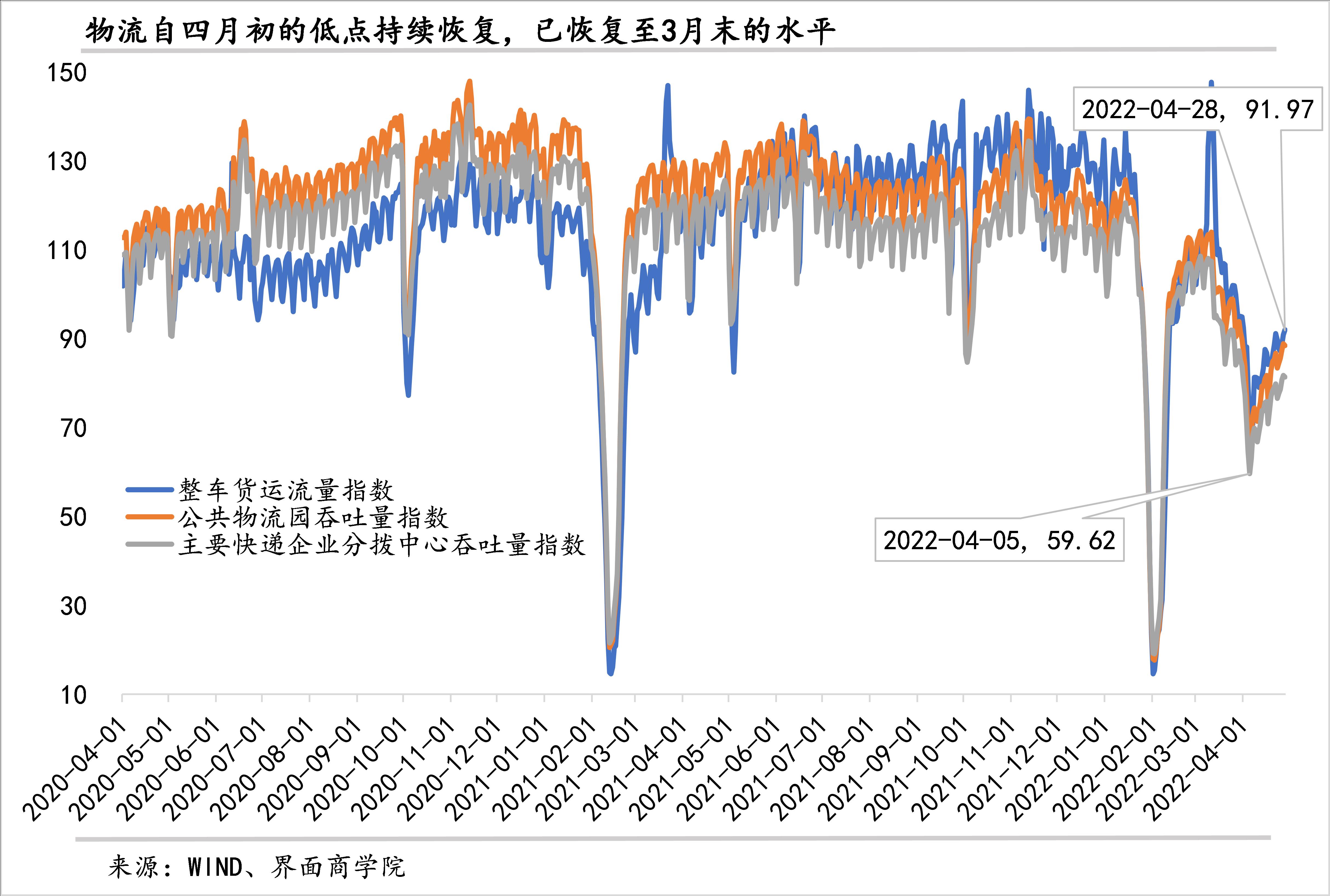 截至4月28日,已经从4月初的低点恢复至3月末的水平。具体来看,整车货运流量指数从4月6日的70.54升至4月28日的91.97,公共物流园吞吐量指数从4月5日的62.94升至4月28日的88.42、主要快递企业分拨中心吞吐量指数从4月5日的59.62升至4月28日的81.33。这些指数以2019年日均值为基准(100)。