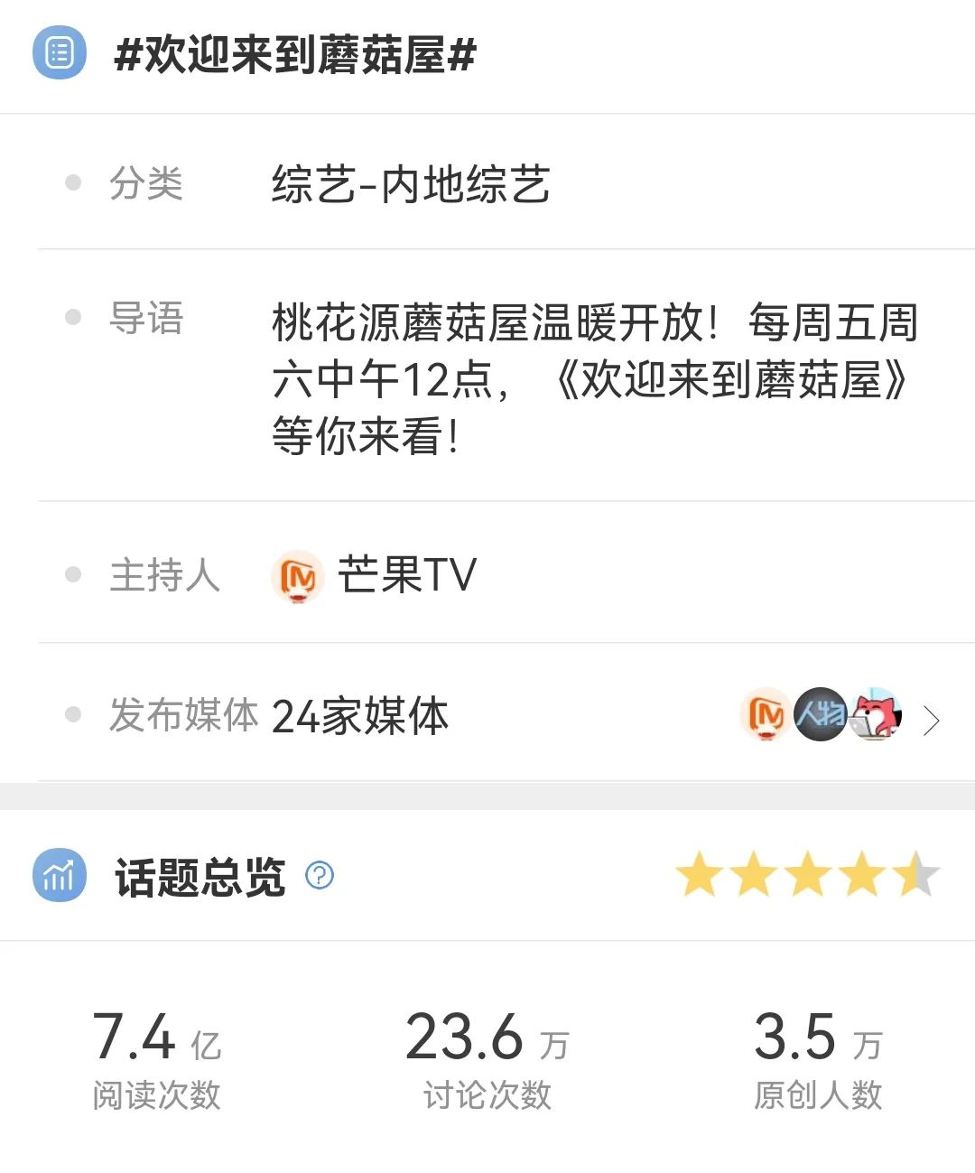 为此芒果超媒似乎也做了不少尝试,例如从芒果超媒王牌综艺之一《向往的生活》衍生出的节目《欢迎来到蘑菇屋》,由于没有流量艺人,也没有金主,其预算吃紧,播出之前的营销、宣发等都默默无闻。但播出后,却多次凭内容出圈,“熟人局是最牛的”“0713出团综吧,我充一年会员”等评论刷屏社交媒体。