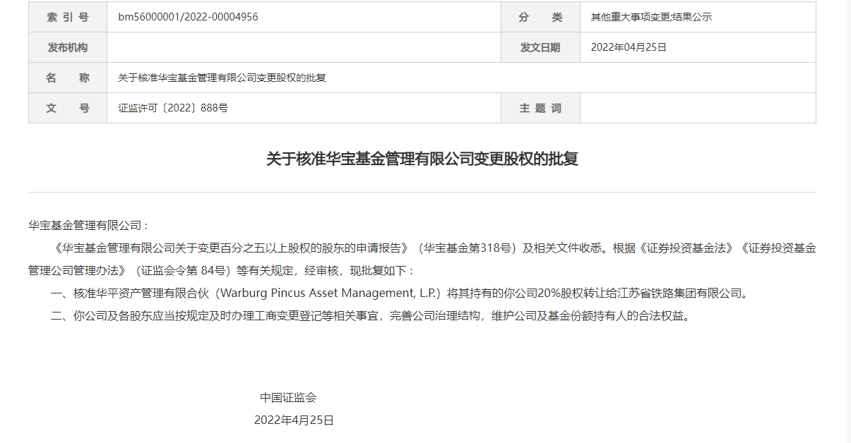 华宝基金股权变更日前获得证监会批准。 证监会网站显示,4月25日,已经核准华平资产管理有限合伙(Warburg Pincus Asset Management,L.P.)将持有的华宝基金20%股权转让给江苏省铁路集团。