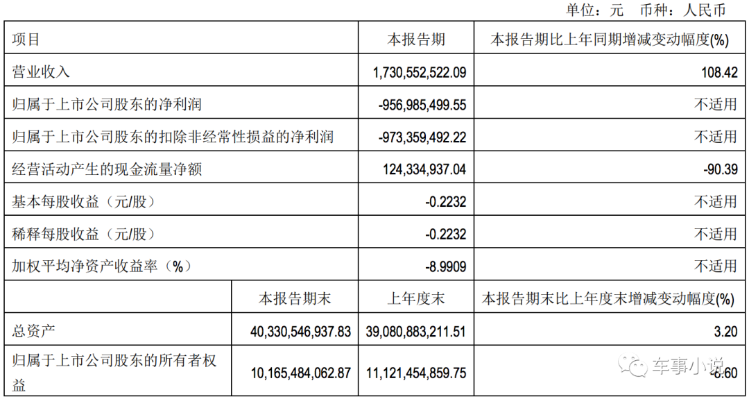 据其在4月27日发布的今年一季度财报显示,一季度,其营业收入为17.31亿元,同比增长108.42%。但净利亏损额较上年同期增加了1.03亿元,亏损9.57亿元。此外,更不乐观的是其经营性净现金流仅为1.24亿元,同比减少90.34%。