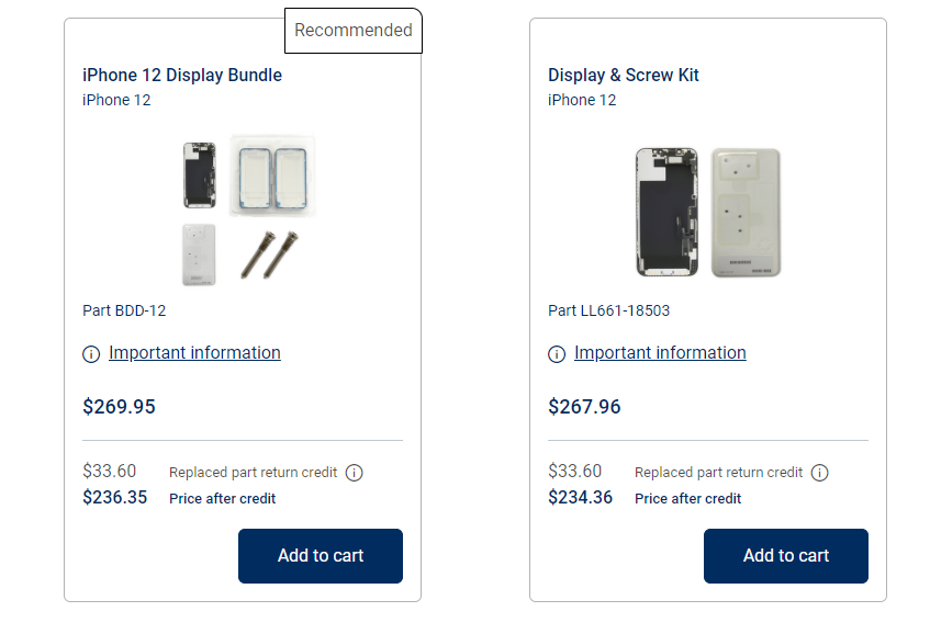 首先是价格问题,以iPhone 12的维修指南为例。要进行iPhone 12的屏幕维修,我们先要选择购买iPhone 12屏幕套装(269美元)或者iPhone 12屏幕(267美元),作为对比,在保修期外让苹果更换iPhone 12的价格是279美元。换言之,自助更换屏幕的价格其实并没有便宜多少。