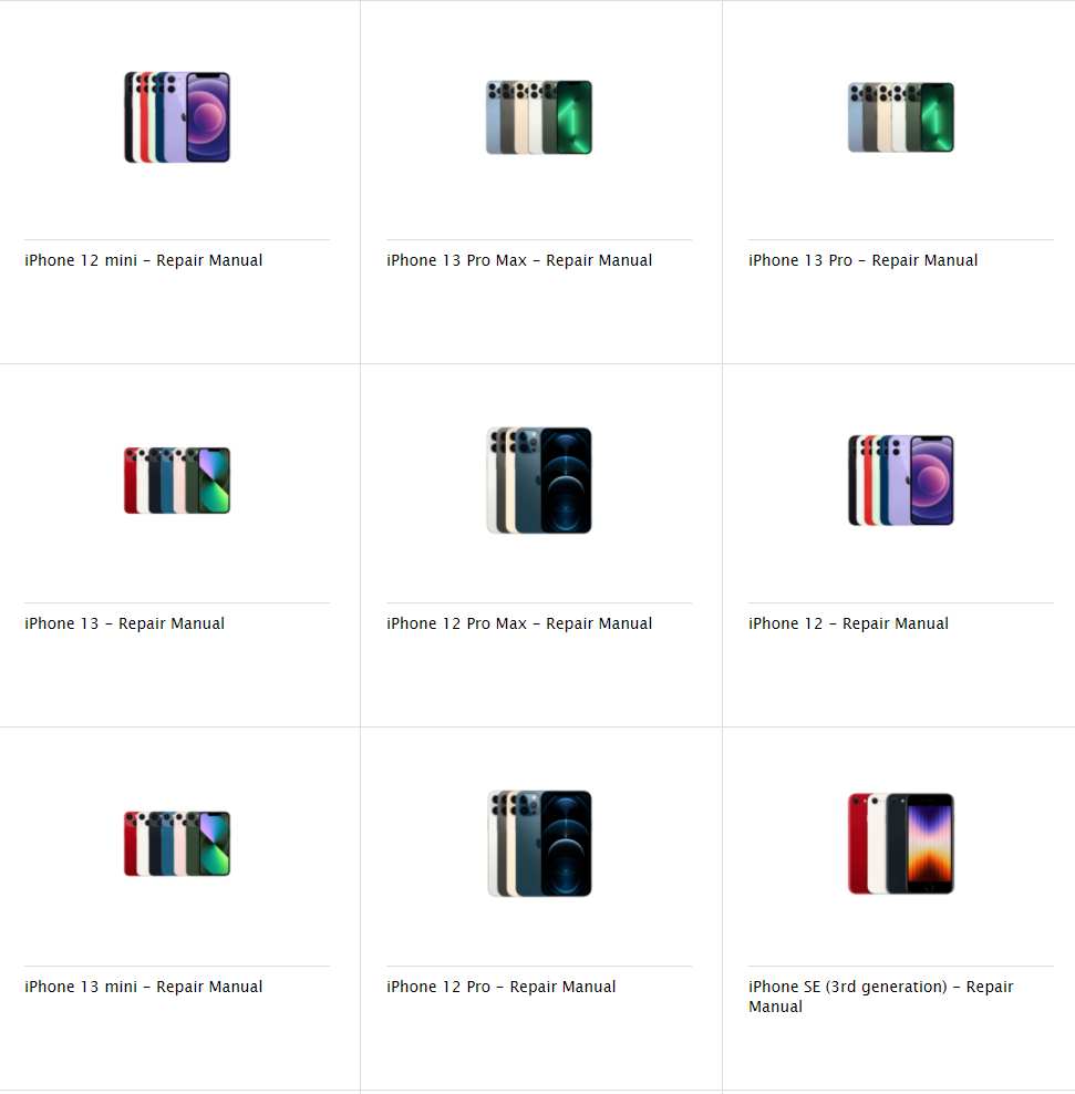 在开始前,我们可以通过苹果自助维修网站(https://www.selfservicerepair.com/)查找想要维修的产品维修手册。目前首批自助维修设备的官方拆机维修手册已经上线,用户可以自行查阅或者免费下载,比较直观地掌握目前手机可能出现的问题。