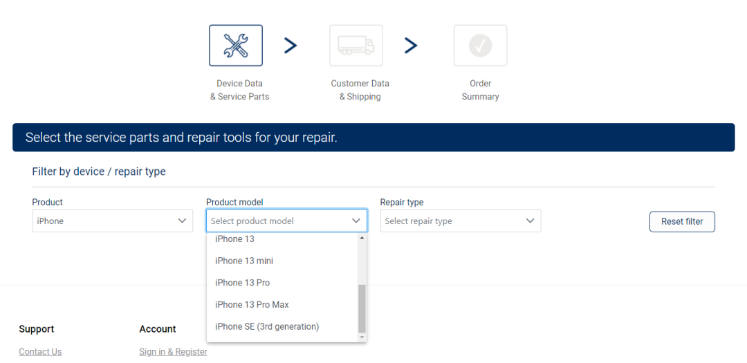 基本确定问题后,我们就可以开始下单了。首先,我们要选择一款设备。目前苹果自助维修仅支持iPhone设备,而且是最新的iPhone 12全系、iPhone 13全系以及iPhone SE 3,诸如iPhone 11系列、iPhone SE 2及过往产品暂时均不支持该功能,苹果表示预计年底前会支持采用M1处理器的Mac产品。