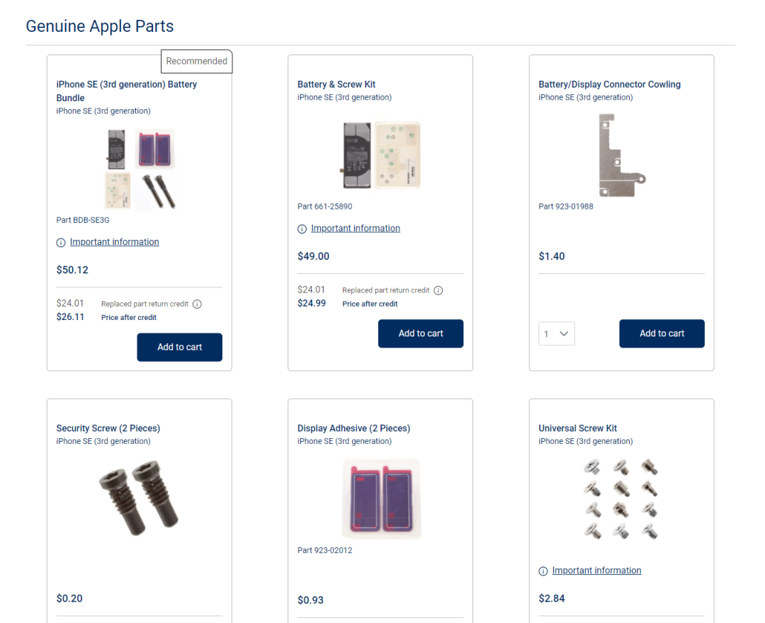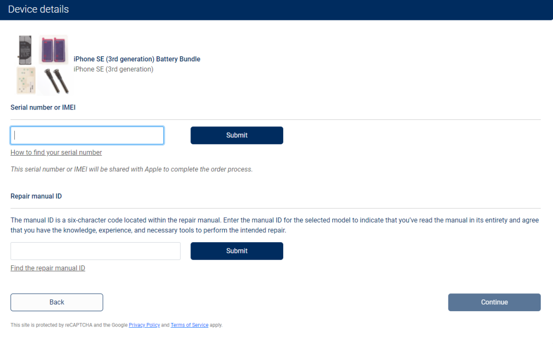 在选好零件以及工具之后,苹果会要求你输入设备的IMEI序列号,用以检查你选择的工具、零件确实是符合你所拥有的产品,并且会要求你输入一组记录在维修说明手册当中的检查码。这种做法,可以确保用户在维修之前核对购买产品与了解维修流程,再决定是否要自行维修。