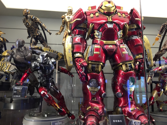 当然,作为版权方的迪士尼也起着重要作用。2009年,迪士尼公司出价42亿美元买下了漫威,随后,在漫威电影中国的宣传活动中,几乎都能看见HotToys的产品展览,不仅包括1:6的可动人偶,甚至还有1:1的人物模型。双方都能从这样的活动中获得更多的关注——电影大卖可以直接促进大家对衍生品的消费,反过来,这些制作精美的手办也是社交媒体上大家愿意自发传播的东西。