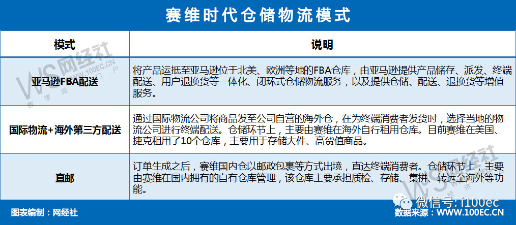目前,赛维时代涉及的仓储物流模式包括:亚马逊FBA配送、国际物流+海外第三方配送、直邮。