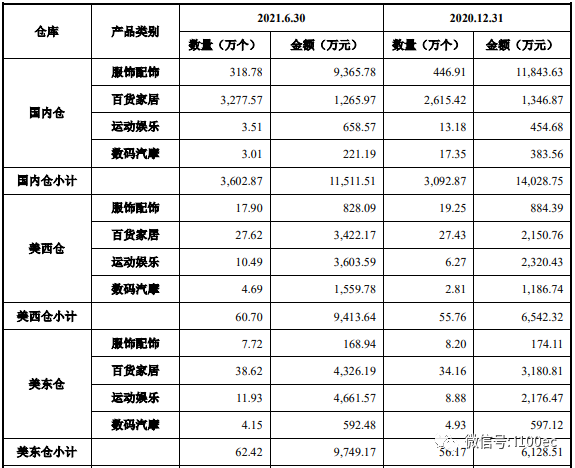 在各仓库存储产品种类、数量和金额方面,国内仓共计仓储商品数量3602.87万个,金额11511.51万元,品类涵盖:服饰配饰、百货家居、运动娱乐、数码汽摩。美西仓中,仓储商品数量60.7万个,金额1559.78万元;美东仓中,仓储商品数量62.42万个,金额9749.17万元;捷克仓中,仓储商品数量28.56万个,金额5806.51万元;FBA仓中,仓储商品数量526.98万个,金额26442.55万元。