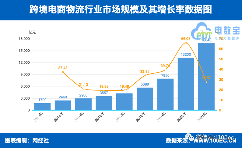近年来,随着跨境电商行业的蓬勃发展,给跨境物流的发展带来了新机遇。据网经社“电数宝”(DATA.100EC.CN)电商大数据库显示,2021年中国跨境电商物流市场交易规模达16840亿元,同比增长27.57%。跨境物流作为跨境电商全产业链的重要组成部分,扮演着跨境电商“最后一公里”的重要角色。