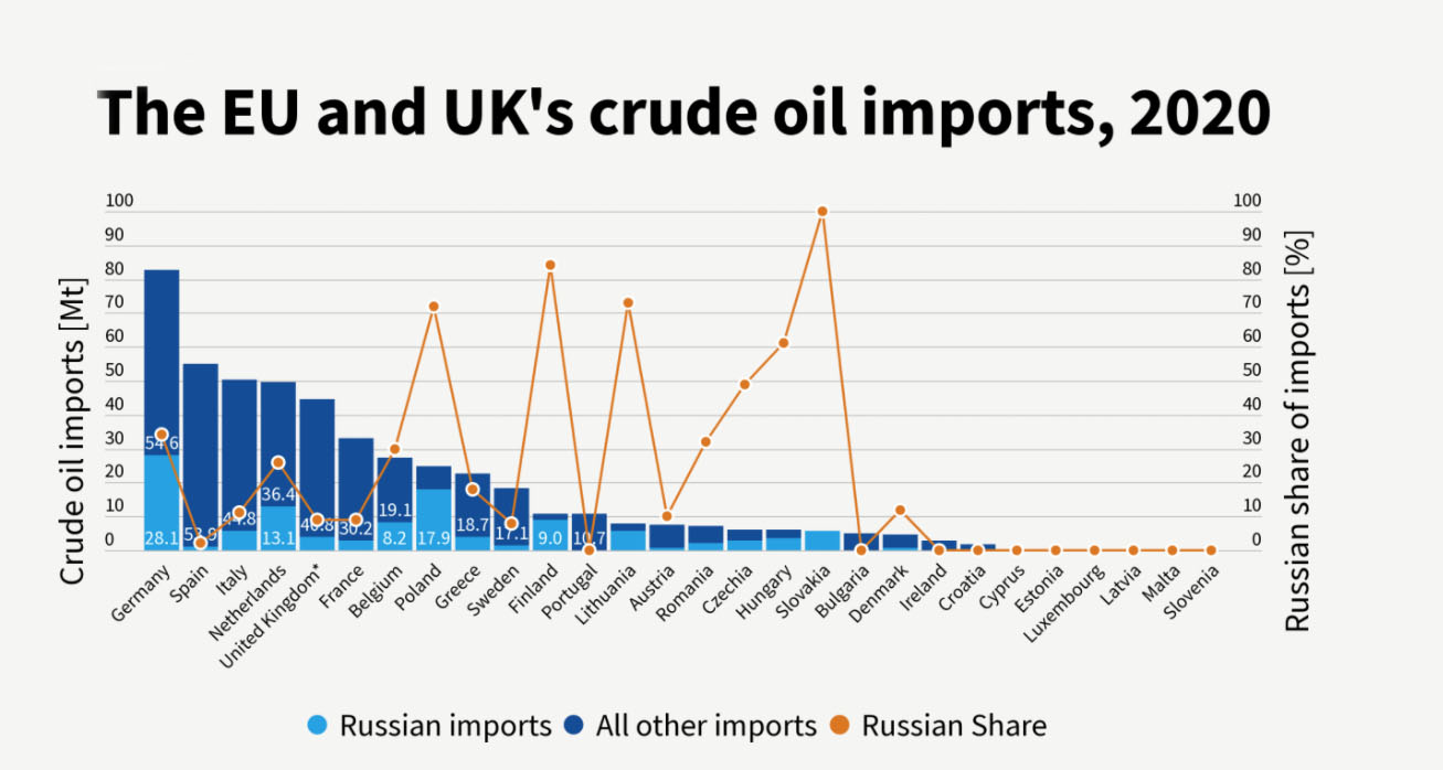 欧盟委员会的数据显示,俄罗斯是欧盟最大的原油进口国,占欧盟原油进口份额的27%。