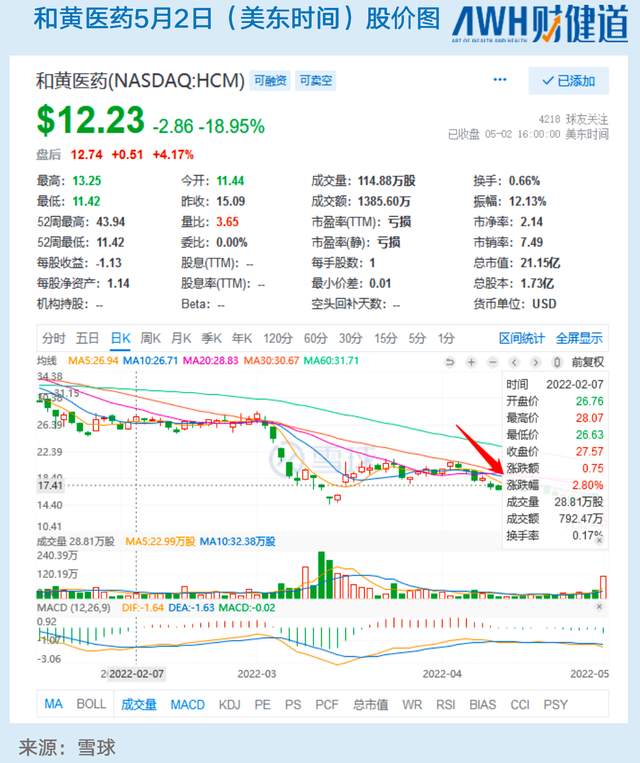 回复函公开后,美东时间5月1日,和黄医药开盘一度暴跌超22%,截至收盘,报收12.23美元/股,跌幅达18.95%。