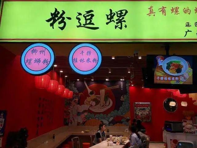 都玩过红斗罗吧,一家品牌连锁米粉店取名“粉斗螺”,既谐音了游戏名,有突出了螺蛳粉的广西特色。
