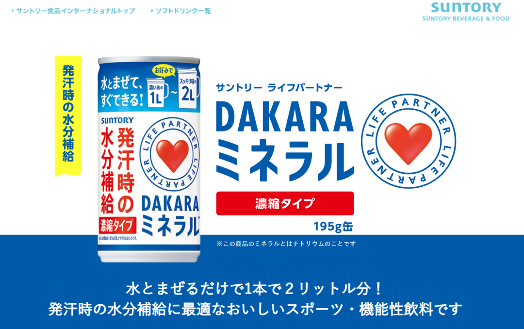 防中暑饮料DAKARA只是三得利饮料产品线的一个分支。而在意识到盐汽水在季节上的局限性后,国内的盐汽水品牌通常的做法是一边维持盐汽水产品原有的优势,同时也积极研发其他品类的新产品。
