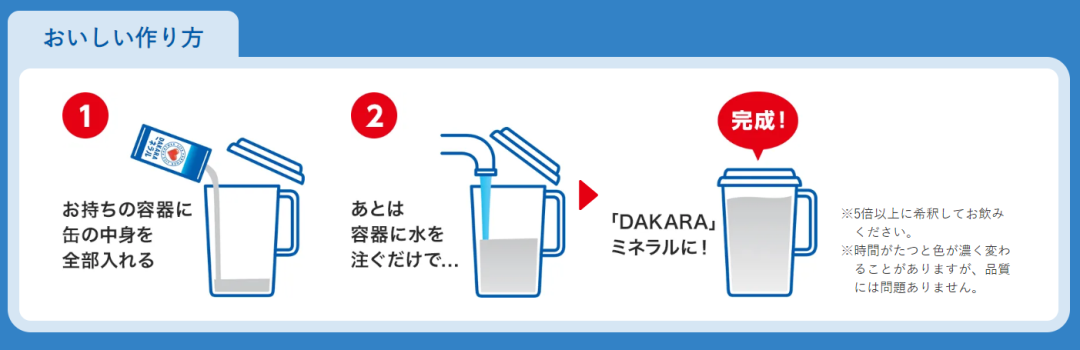 同样是补充水分和盐分的作用,针对“主动流汗”的运动场景,DAKARA还有浓缩款饮料,作为日常必备用物资放在家里节省收纳空间,也方便消费者需要时随身携带。