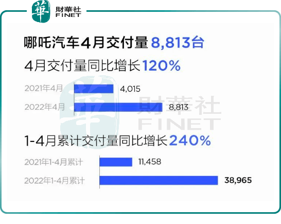 数据显示,哪吒汽车4月销量达8813辆,同比增长120%,环比下跌26.72%。至此,哪吒汽车实现了自2020年7月以来连续22个月同比增长。2022年1-4月累计销量38965辆,同比大增240%。