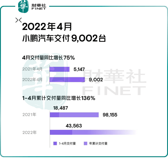 4月,小鹏汽车交付9002台,环比下滑41.6%,同比增长75%。2022年1-4月,小鹏汽车累计交付43563台,同比增长136%。