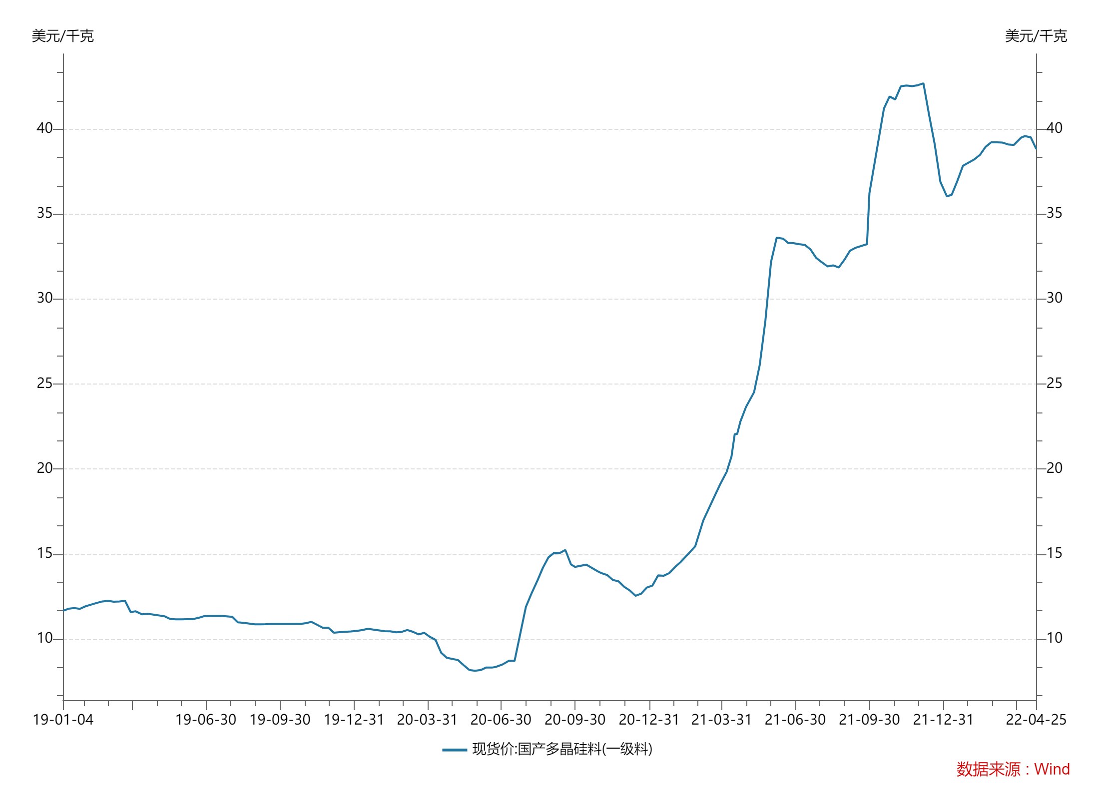 硅料价格快速上涨给硅料龙头企业带来了丰厚利润。2020年5月底以来,多晶硅料(一级料)价格已由此前的8.13美元/千克一路上涨,涨幅一度超过4倍。截至4月25日多晶硅料(一级料)价格为38.82美元/千克,今年来仅上涨5.2%,相较2021年初则上涨195%,涨幅出现收窄迹象。需要指出的是,由于硅料产能扩张时间在整个光伏产业中最长,一般为12个月至18月,而从开工至满产一般需要半年左右,因此硅料价格上涨周期较长。